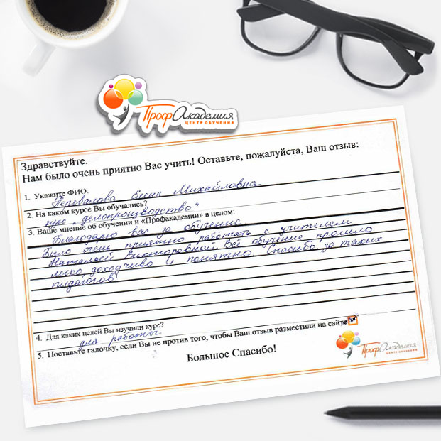 Обучение кадровому делопроизводству прошло успешно, "Профакадемия" предоставила быстрый срок обучения, персонал доброжелательный и вежливый, по всем вопросам отвечали быстро и понятно. Буду рекомендовать Вас своим близким.