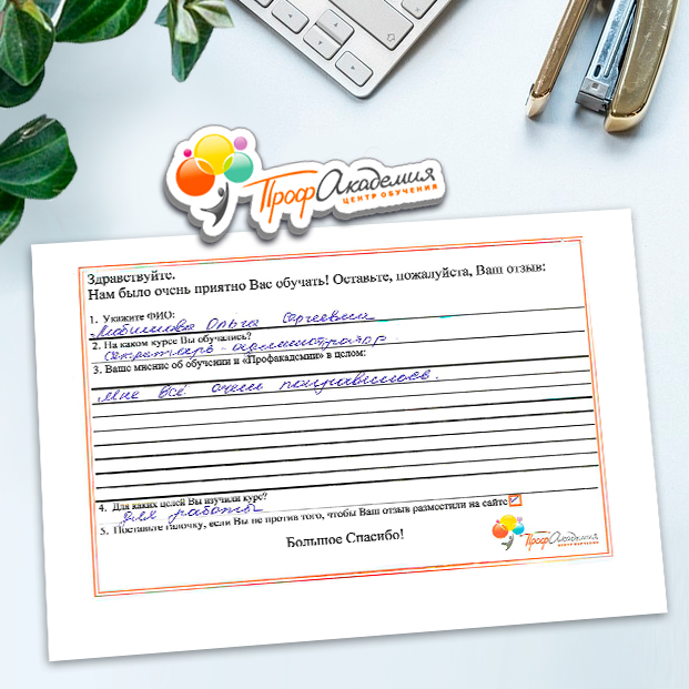 Здравствуйте! Огромное спасибо за предоставленные курсы обучения на администратора. Все очень доступно и понятно. Курсы администратора - новое направление в моей деятельности и для меня очень важно было четкое последовательное изложение материала. Благодарю за проведенное обучение и желаю успехов в профессиональной деятельности.